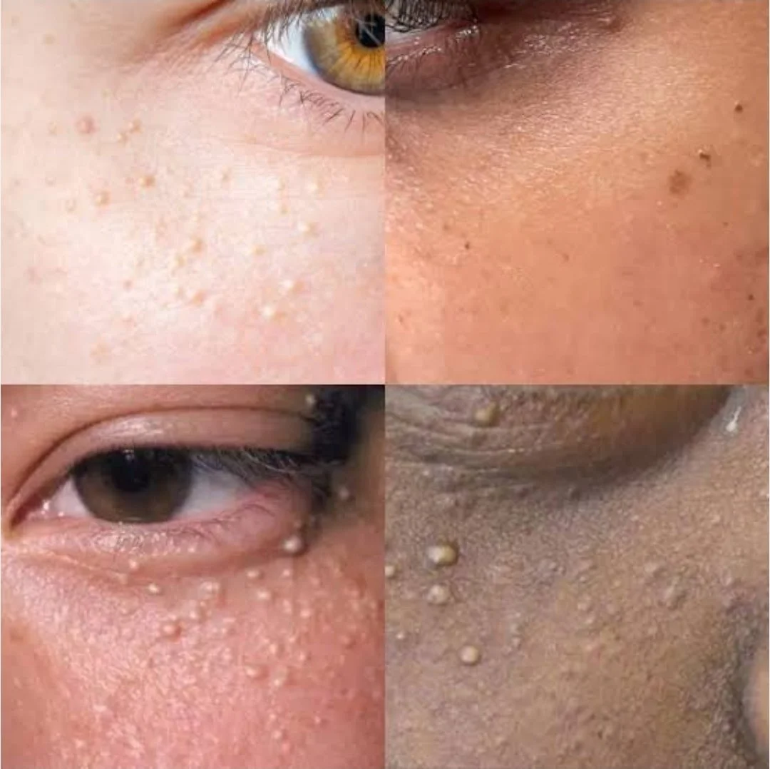 Milia are tiny, harmless, pearly white bumps or cysts that form when dead skin cells (keratin) get trapped under the skin's surface, often appearing on the face (cheeks, nose, eyelids) but can be elsewhere, common in newborns (milk spots) but also adults, and distinct from acne as they don't have a pore opening and won't pop easily.